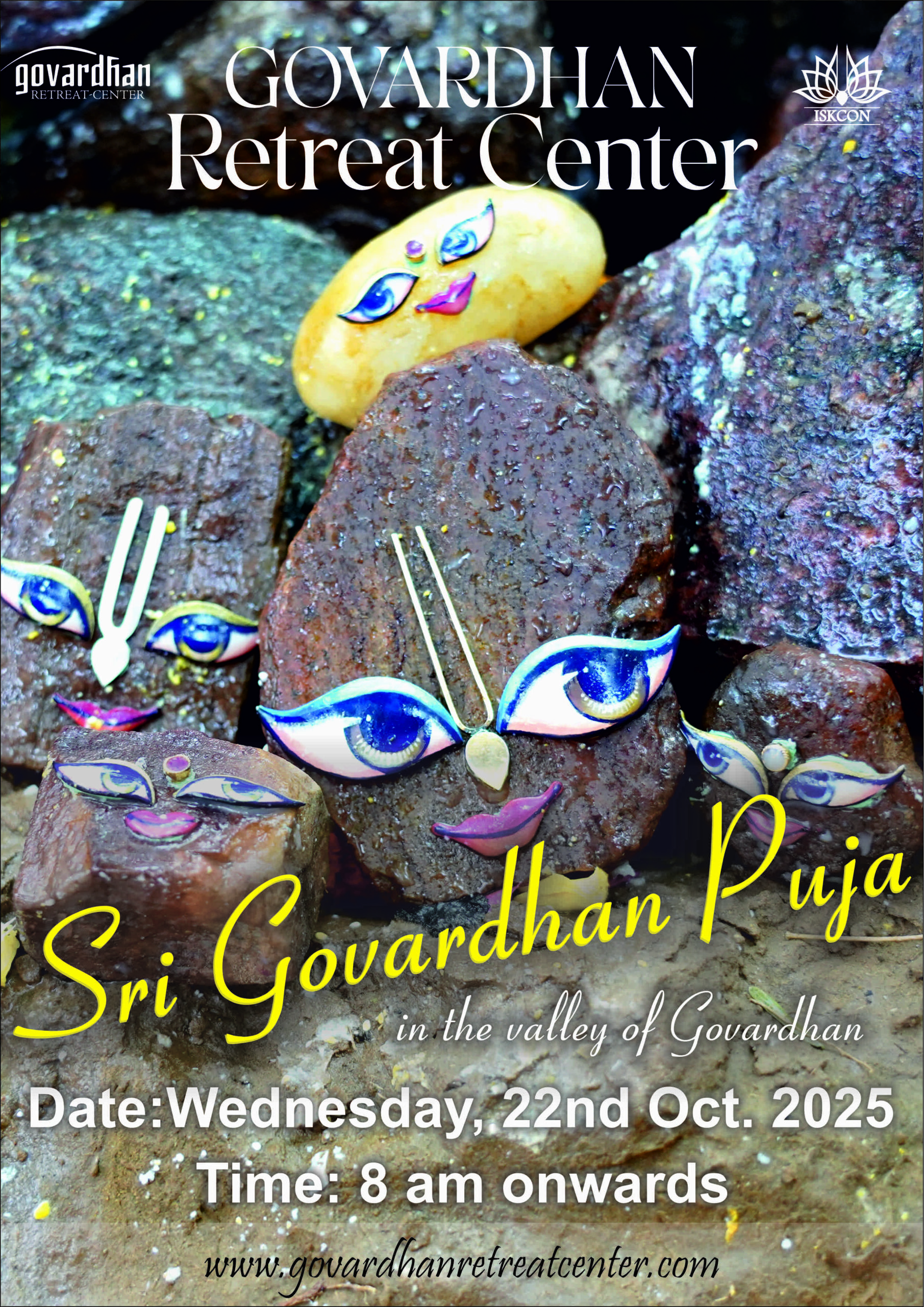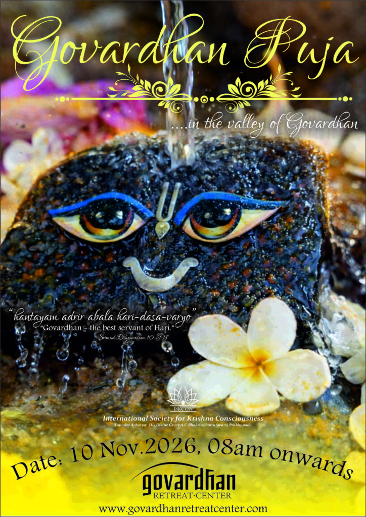 Here at the Govardhan Retreat Center, we, along with many visiting devotees, enthusiastically celebrate Govardhan Puja in the valley at the foothills of the Govardhan forest. The program will begin with Go-puja and kirtan followed by hearing of Krishna’s Govardhan pastimes from HG Bhurijana dasa and HH Sacinandana Swami.