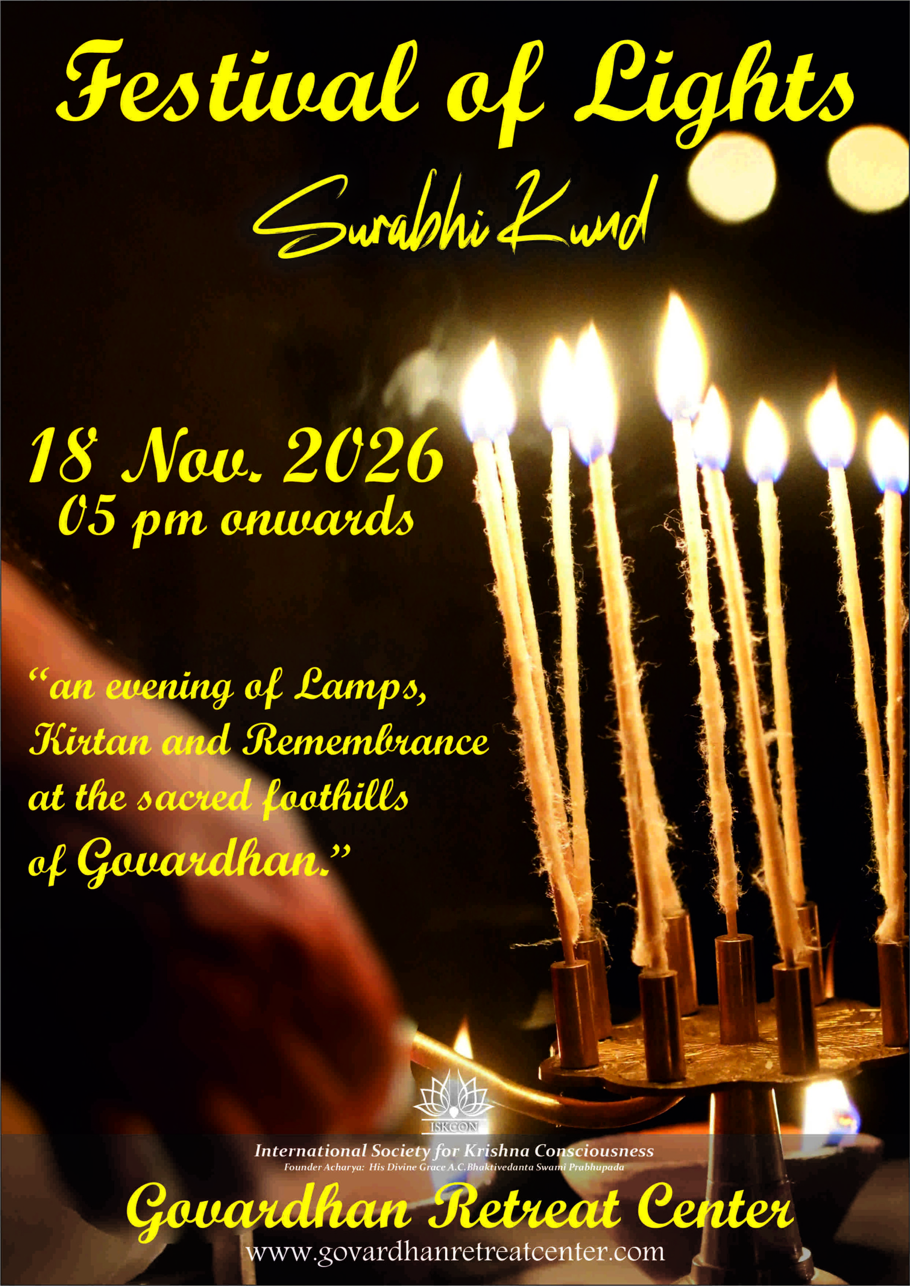 We joyfully invite everyone to attend our annual Surabhi Kund Festival of Lamps in the welcoming shelter of Giriraja Govardhana.